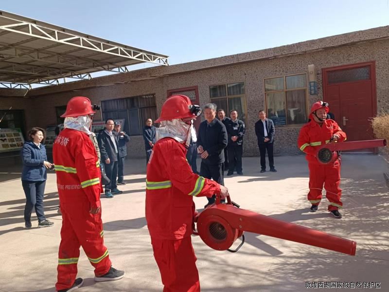 指导组在玉门关保护站,首先对防火物资储备进行了检查,详细询问了灭火工具的使用、维护和日常保养情况,并组织工作人员试穿防火服、拉响防火设备,现场展示防火队伍的业务操作水平和预警能力。