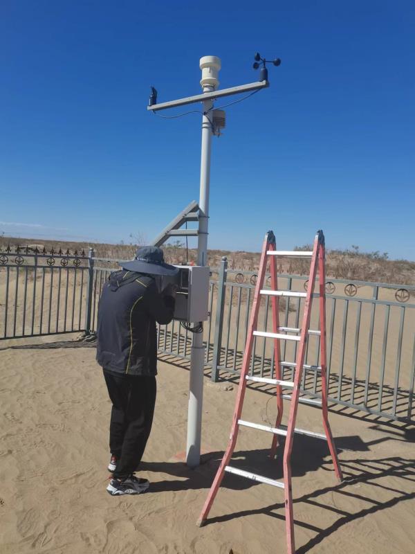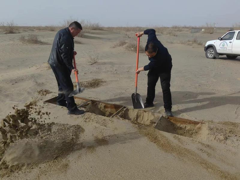 现场工作人员主要对风蚀样地和集沙槽内的积沙进行清理,大家挥动铁锨等工具,分工明确,齐心协力,经过几个小时的辛勤作业,终于将风蚀样地和满是积沙的集沙槽清理干净;另外工作人员还对观测和固定样地样线和样桩进行加固,并按要求维护气象监测设备以确保其正常运转。